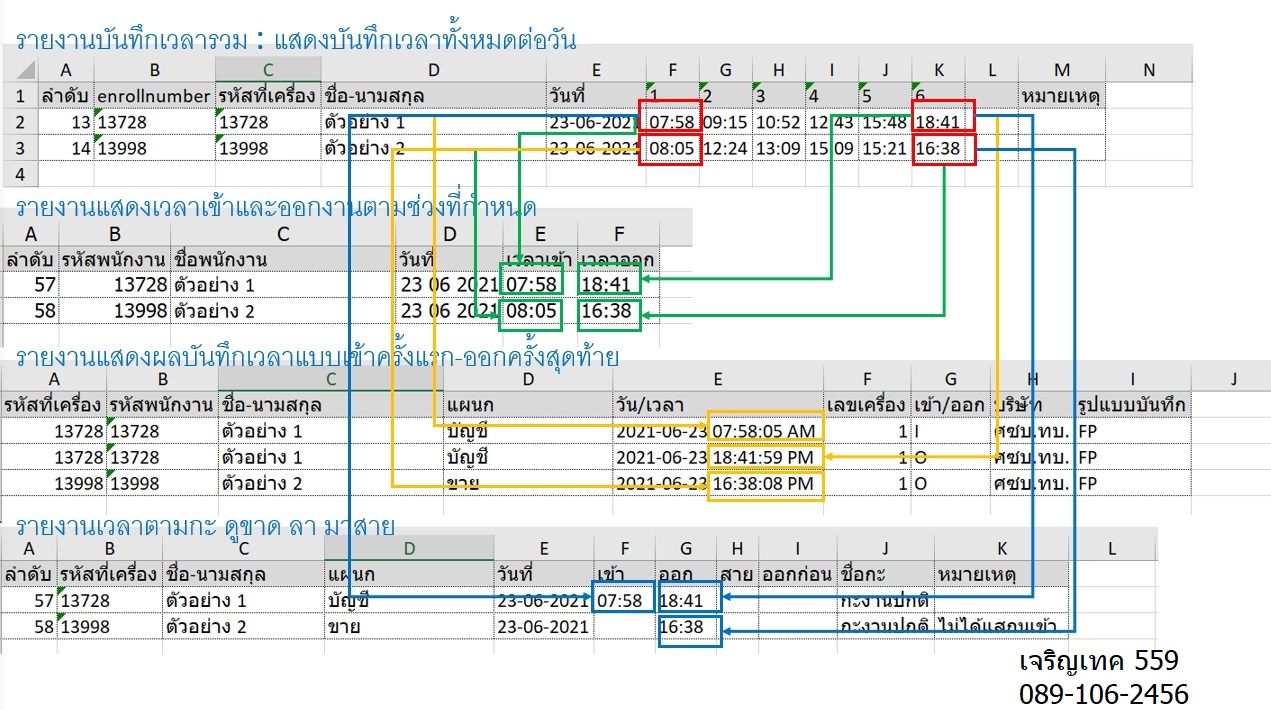 วิเคราะห์รายงาน 1. หากพบว่ารายงานบันทึกเวลารวมมีข้อมูลมากกว่า 1 บันทึก เช่น 07.58, 09.15, 10.52, 12.43, 15.48, 18.41 เป็นต้น ในรายงานแสดงบันทึกเวลาแบบเข้าครั้งแรก/ออกครั้งสุดท้ายจะต้องแสดงผล เข้า 07.58 และออก 18.41 หากไม่เป็นเช่นนี้แสดงว่าโปรแกรมมีปัญหาให้ติดต่อผู้จำหน่ายเพื่อดำเนินการแก้ไข
